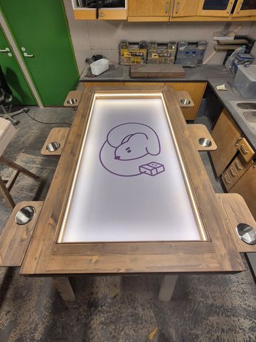 Gir ca 14,5 cm x2 mindre brønn enn utvendige mål på bordet. Muligens noe bredere grunnet ledlys transformator